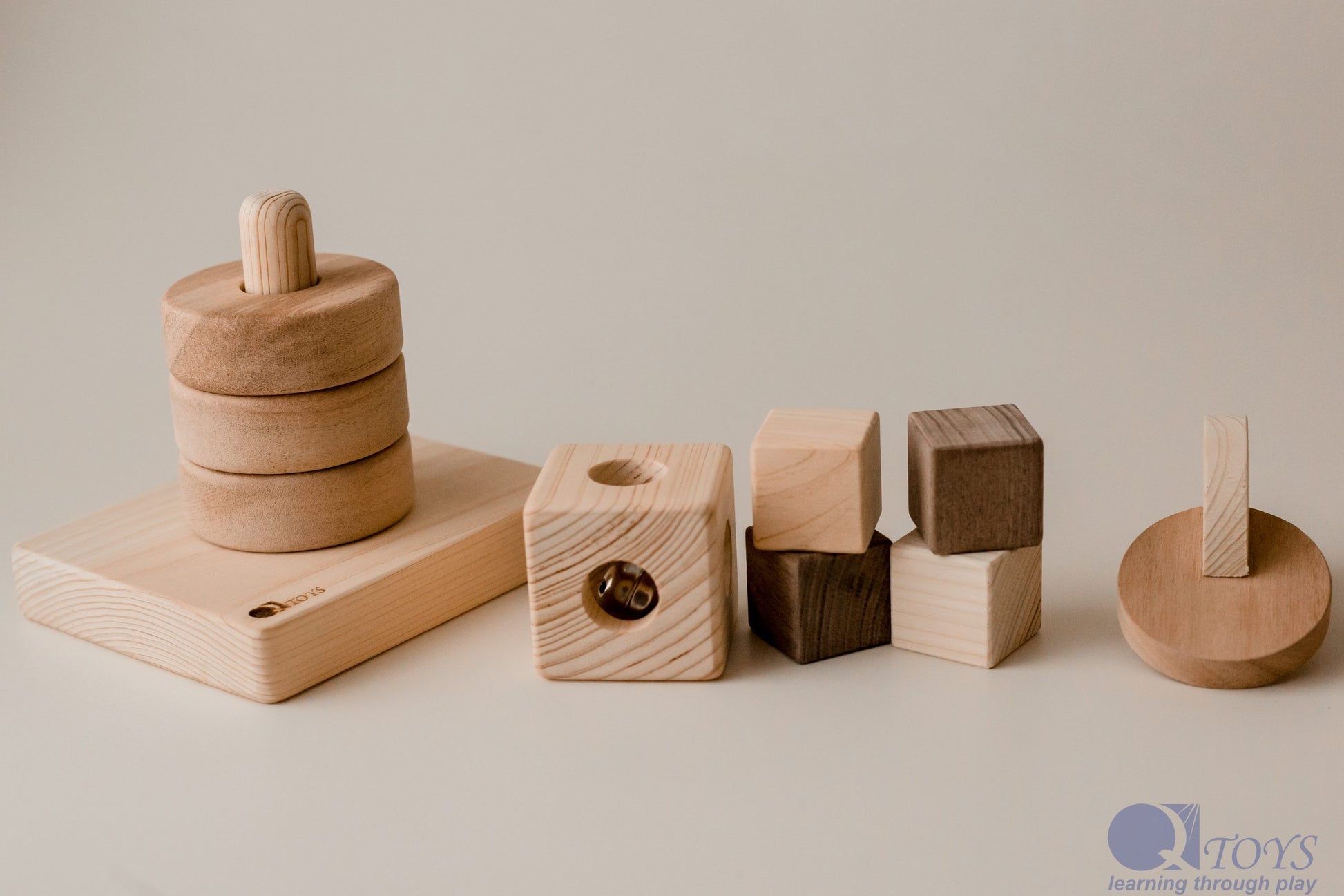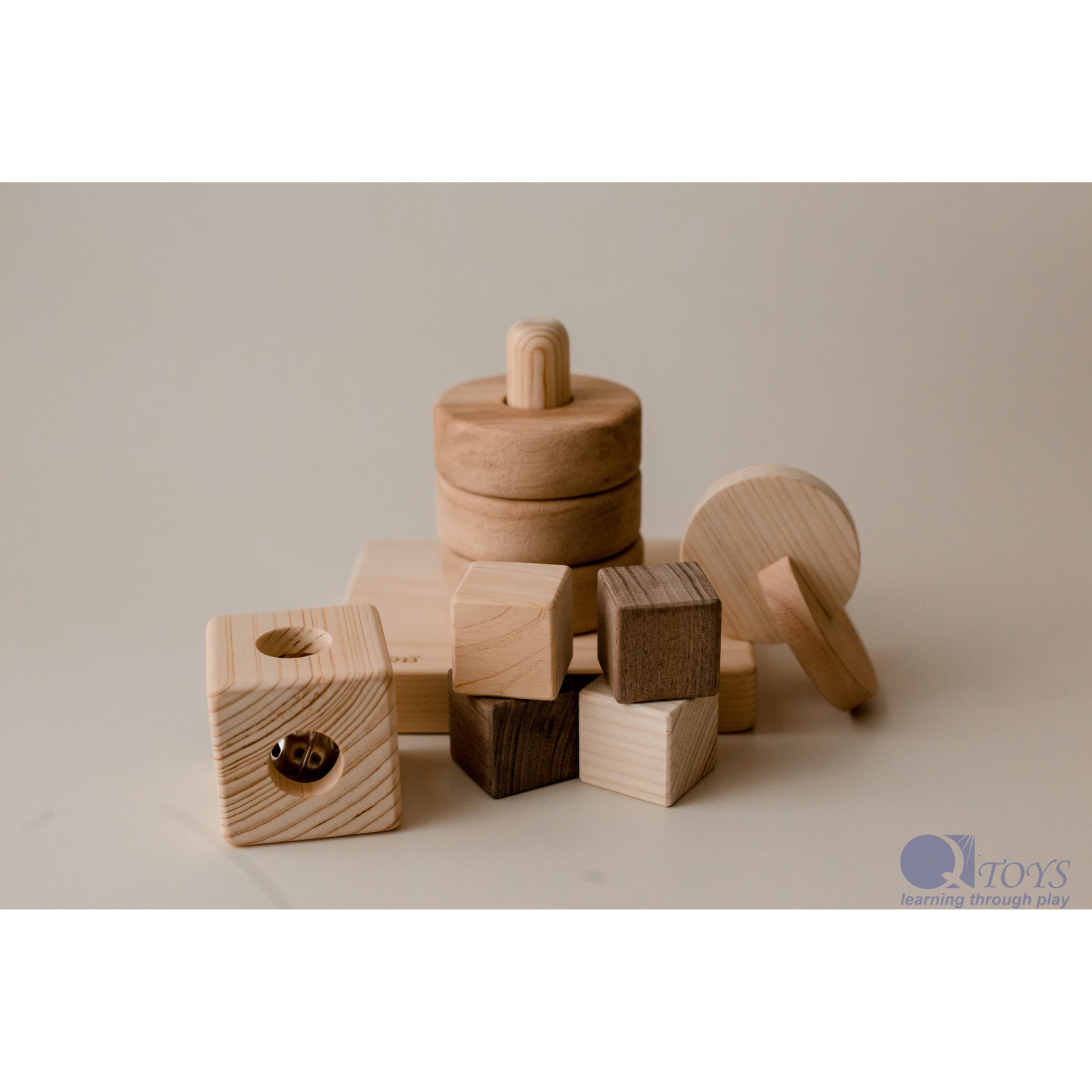 The Q Toys Baby Shower Gift Set is a beautifully considered collection of Montessori-inspired wooden toys designed for a baby’s earliest months. Bringing together the Dual Discs, Vertical Ring Stacker, Cube Rattle and a set of 4 wooden blocks, this bundle supports grasping, transferring, stacking and balancing through simple, purposeful play.