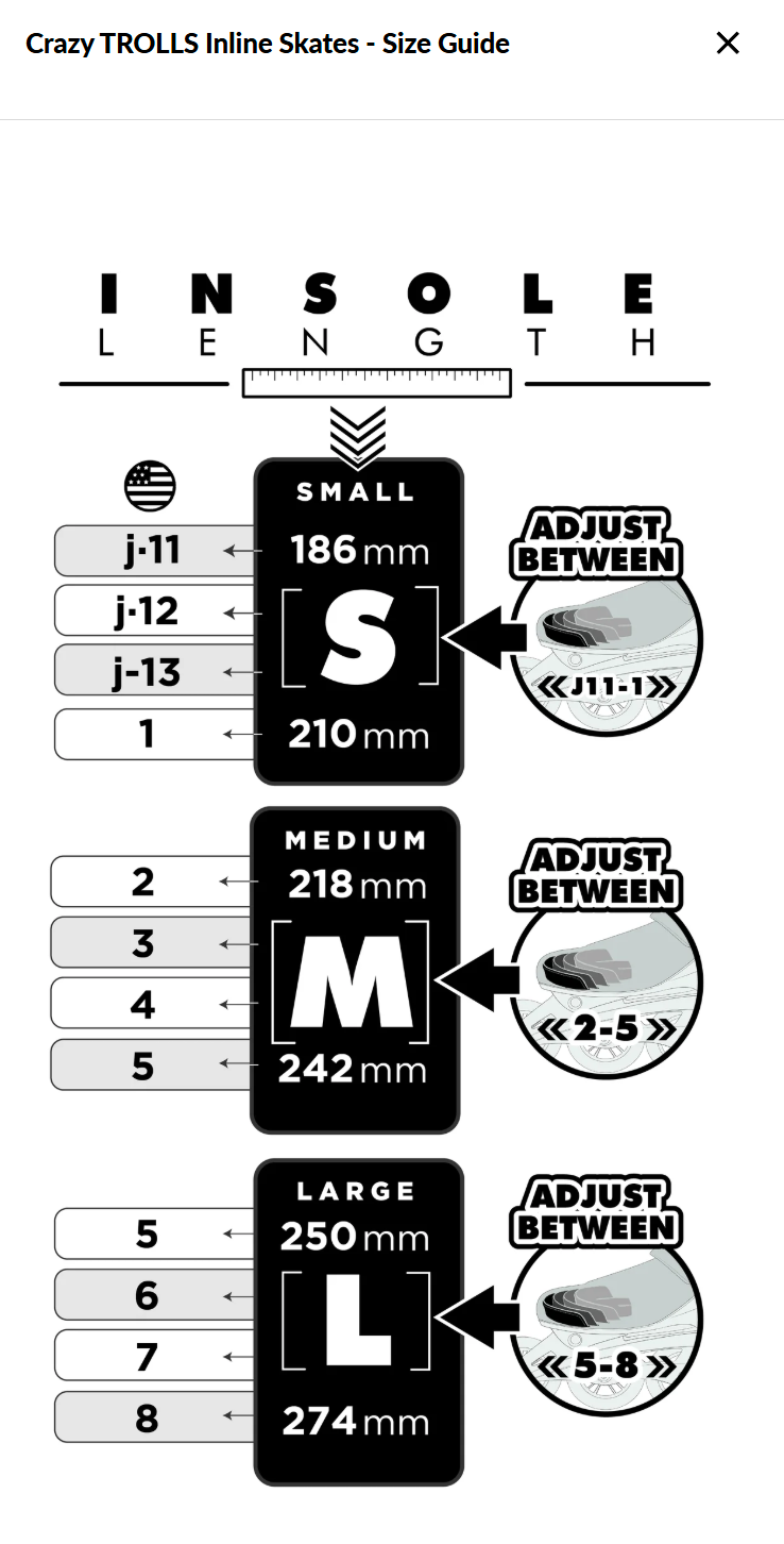 Available skate sizes: Small (J12-2), Medium (3-6)