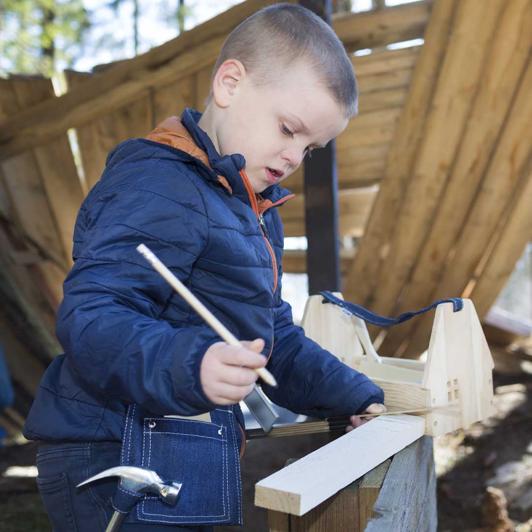 The carpenter’s belt contains a hammer, screwdriver, set square, pen, sandpaper and a packet of screws and nails – everything your little carpenter might need! These tools are small and ideal for little hands. Now everyone can help with carpentry work! This is not a toy but a real tool belt with smaller tools.