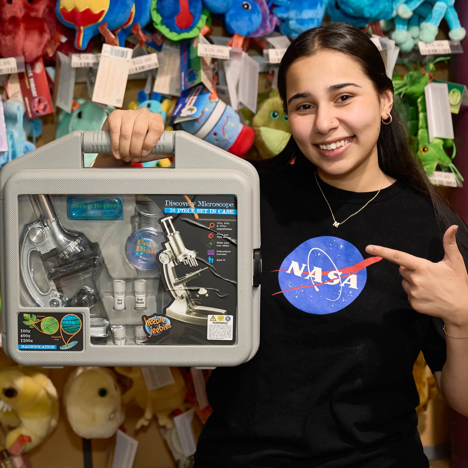 This stylish microscope comes with a sturdy carry case and everything you need to start your discovery of the microscopic world! This kit includes 5 prepared slides, 7 blank slides, brine, dye, a petri dish and more!