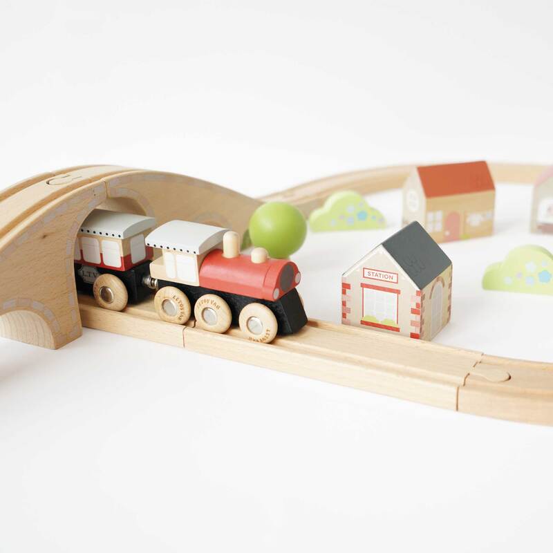 Perfect for eco-conscious parents, it's made from FSC®-certified wood and contains 40 pieces to inspire endless role-playing possibilities. With a figure-of-eight track design, three arched stone bridges and a range of highly detailed buildings including a station, market, hospital and farmhouse, your little one will love creating their own mini world.