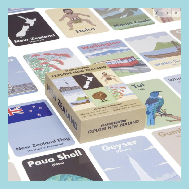 Explore New Zealand Flashcards - Each card features a NZ icon, historical tradition, or experience, including beautiful designs of the Tui Bird, Auckland's Sky Tower, and a Waka (canoe). Beneath each English word on every card is a Maori translation, which adds another element of language learning.
