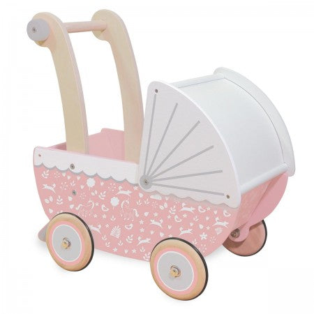 The Loxhill Pram is a strong and stylish scandinavian-style wooden doll pram, that includes a fully integrated hood and rear handle with protective bumpers. Its rubber-edged wheels glide over both indoor hard and carpeted surfaces and comes semi-assembled for easy setup. Fits rigid body dolls up to 25cm laying down but will fit flexible dolls up to 40cm. Doll and bedding not included.