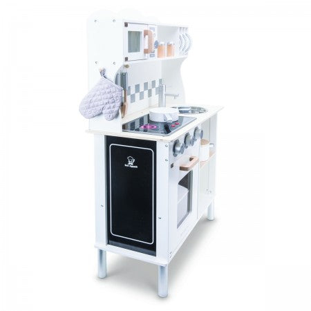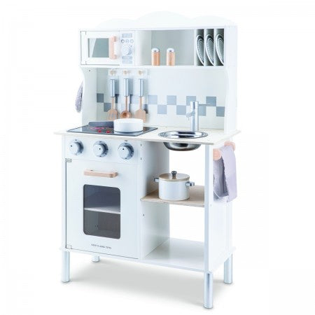 The Modern Kitchen – White by New Classic Toys is a beautifully built wooden play kitchen with a sleek, contemporary look and everything kids need for realistic pretend play. It features a stovetop, oven with clicking dials, microwave, sink, cupboard space and a full set of accessories - all scaled for little hands and big imaginations.