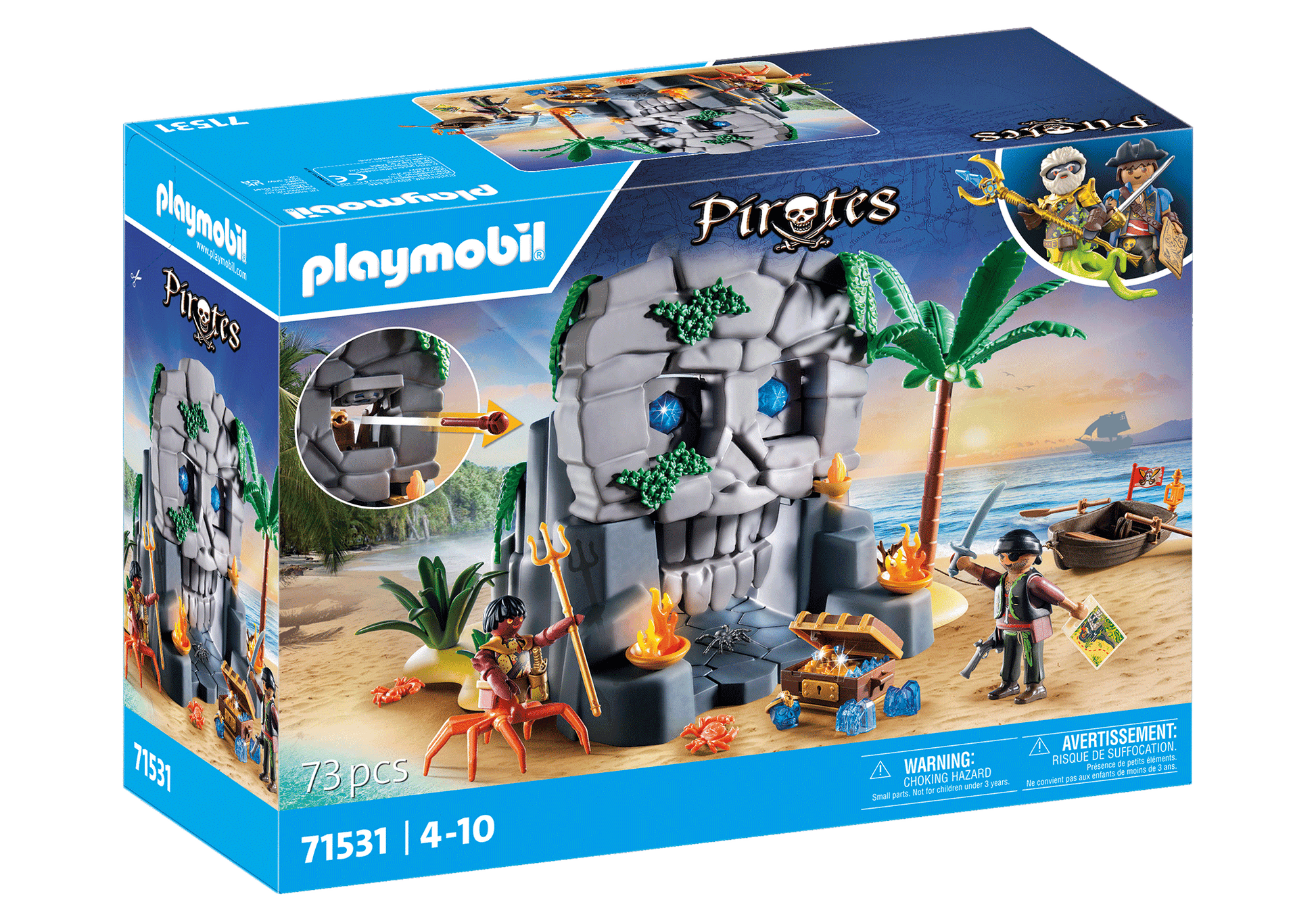 The pirate has reached the legendary Crystal Skull Island with his boat, but before he can plunder the hidden treasures, he must face the swift Crab Deeper. The island itself is well protected against pirates: Upon opening the entrance, the crystal eyes of the island vanish, revealing two cannons ready to fire ... Only after skilfully evading the projectiles does the treasure belong to the pirate! Which brave buccaneer dares to venture onto the mysterious PLAYMOBIL Skull Island?