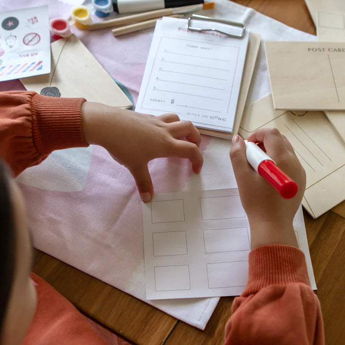 Whether they’re painting postcards, posting parcels or leaving calling cards for the family, kids can craft their own postal adventures – at home, at the play table or alongside the iconic Make Me Iconic Post Box (sold separately).