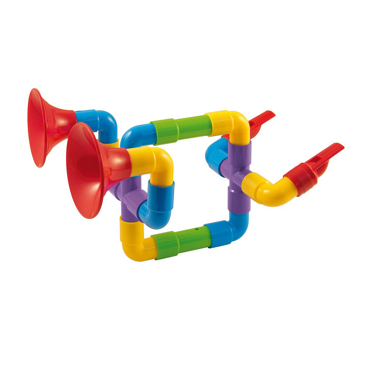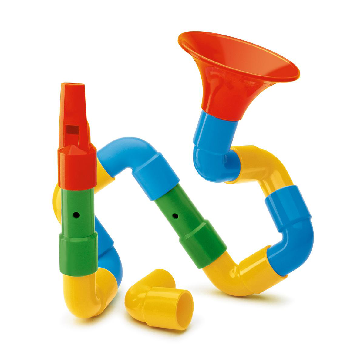 Includes: 3 straight tubes with holes, 1 whistle, 1 trumpet end, 11 straight tubes and L-shapes in 2 colours