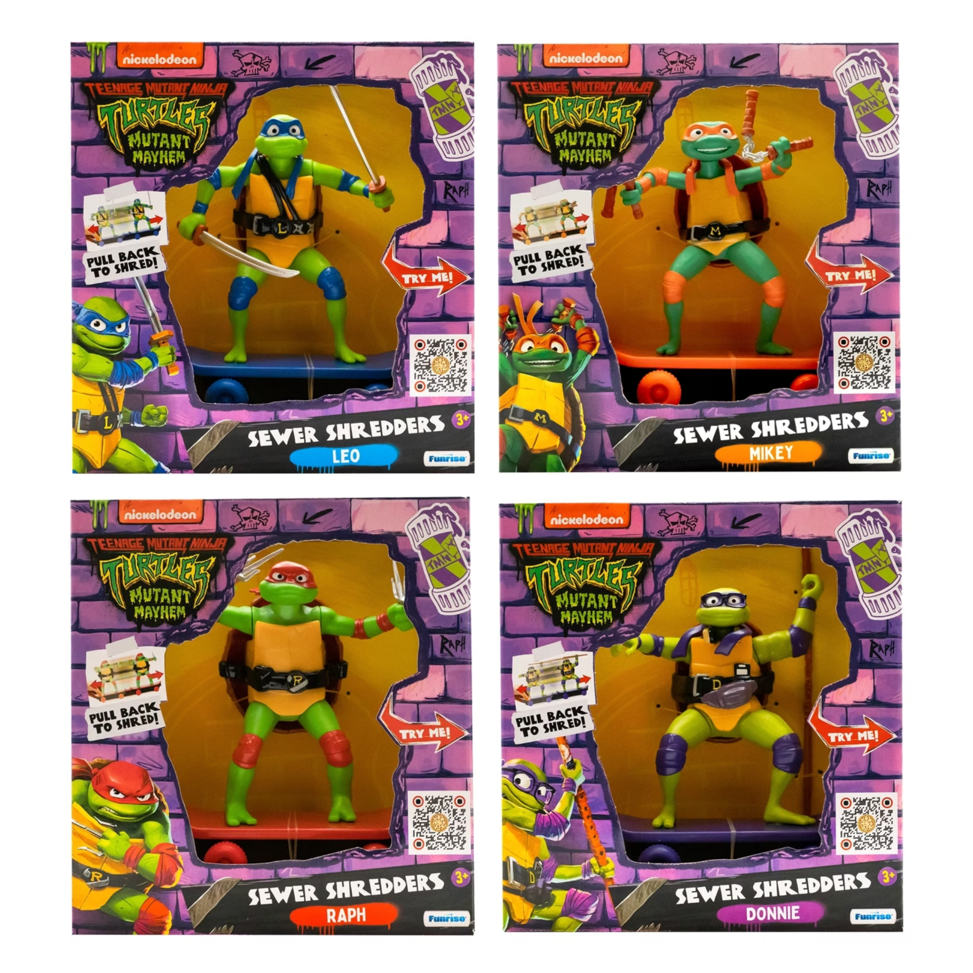 Get ready to race out of the sewers with the TMNT Mutant Mayhem Sewer Shredders from Funrise. These turbo-charged, pull-back skate toys let kids team up with their favourite Turtle or villain and launch into fast-paced adventures. Choose from 5-inch figures of characters like Donatello, Leonardo, Michelangelo, Raphael, or Shredder — each on their personal skateboard, inspired by the hit “Mutant Mayhem” movie. Pull back, let go, and watch them zip forward to battle mode by pressing the button on their shell. Collect all 4 Turtles or go wild with Shredder for maximum play. Suitable for ages 3+
