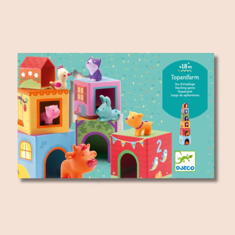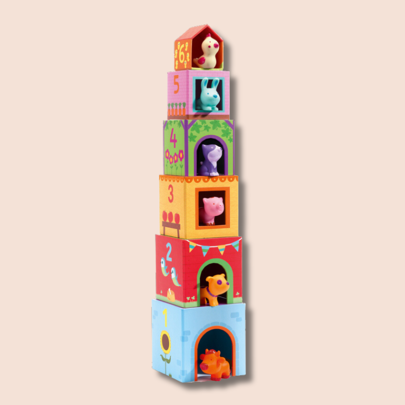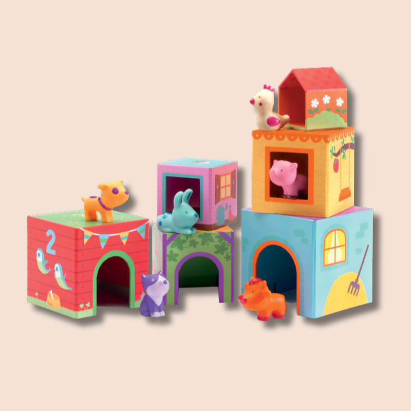 Build a beautiful farm with this fibre-board blocks and tower set, includes 6 nesting boxes and 6 whimsical farm animals. Beautifully decorated in a country farm theme (some sides with numbers), these boxes can stack into a tower or nest together, each animal fits inside. Helps build motor skills. sequencing, storytelling and role playing.