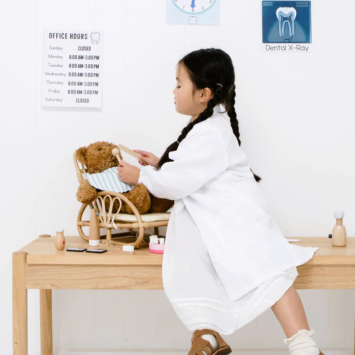 This fantastic role play kit will help to reinforce all those conversations about teeth care and healthy habits. It also promotes imaginative play and encourages nurturing behaviour "Wolfie, open wide and say ‘Aaaah’". Anyone can aspire to be a dentist or dental nurse and inside this kit are the 'instruments' your budding practitioner might need. All pieces are child-sized and made of wood to hold-up over time. Take your dental clinic on the road in its beautiful carry box and combine it with our Doctor's dress up kit for the full experience.